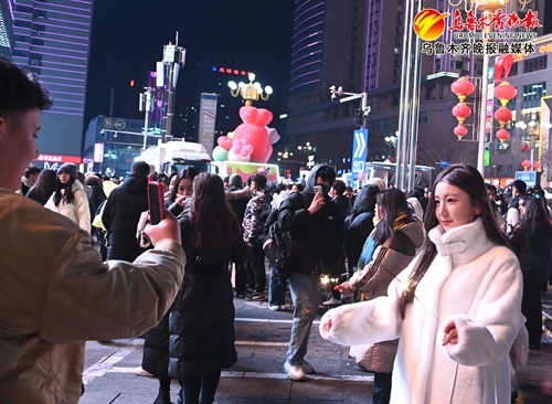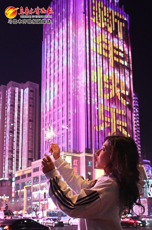 2024年12月31日22时04分,在西大桥“你好2025”主题灯光秀现场,一名女孩手持烟花拍照,迎接2025年新年到来。 记者陈岩摄“看乌鲁木齐今晚多漂亮,明年我还要在这踏踏实实、一步一个脚印继续努力,把家安到这。”魏宏烨说。