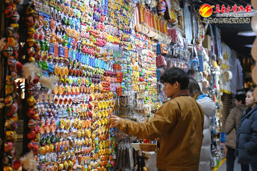 2月25日,在金泉商城,游客挑选新疆美食元素的文创冰箱贴。