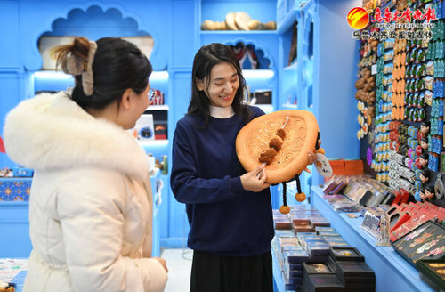 在大巴扎步行街“这礼是心疆”文创店铺,毛绒绒的“馕”搭配毛绒版“烤肉”,吸引了不少游客的目光。(2月25日摄)