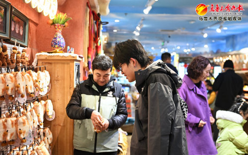 2月25日,在大巴扎步行街阿凡提精品礼物馆,游客在挑选新疆美食文创玩偶。