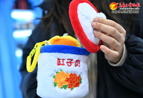 在大巴扎步行街“这礼是心疆”文创店铺,美食“缸子肉”被做成了可爱的毛绒玩具。(2月25日摄)